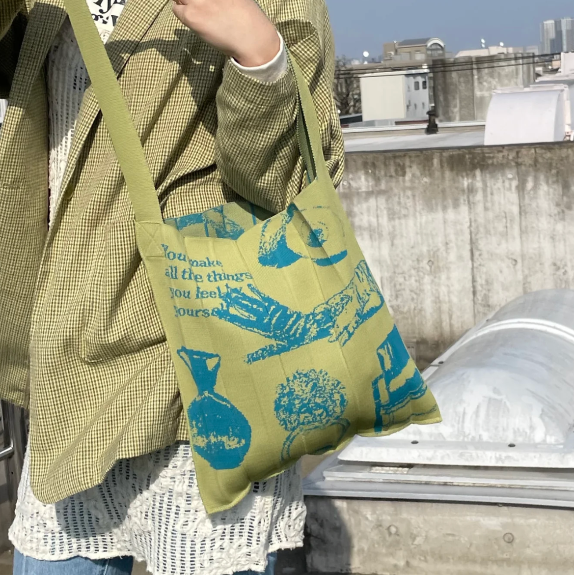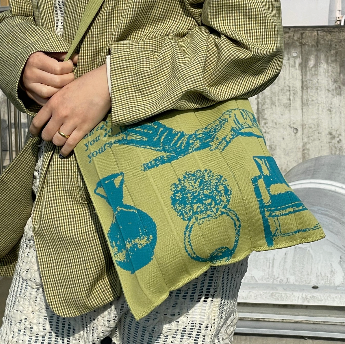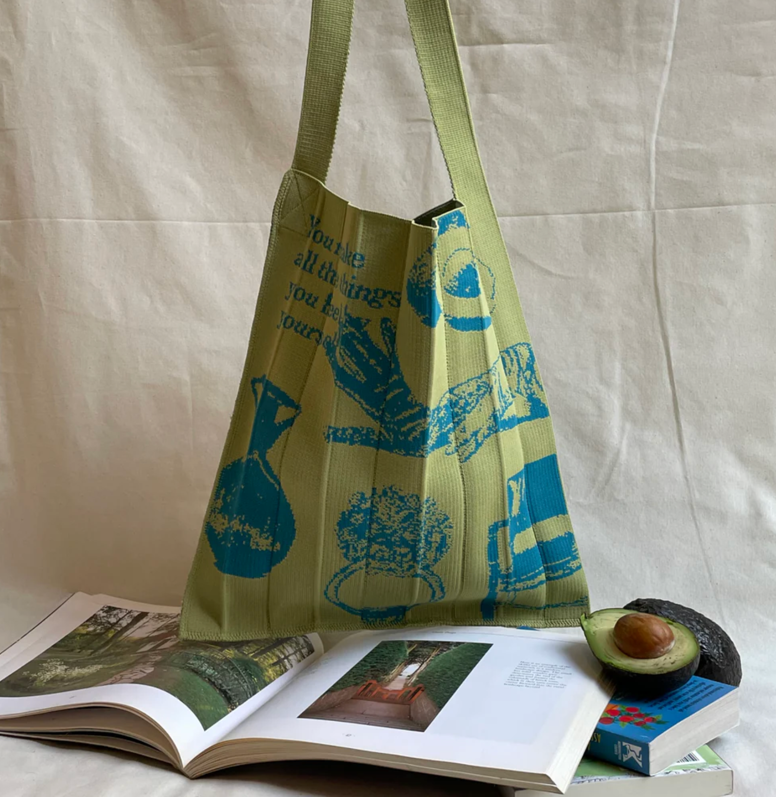 アボカドなどのイラストが、グリーンやターコイズの糸で編まれたユニークで遊び心あふれるバッグ。