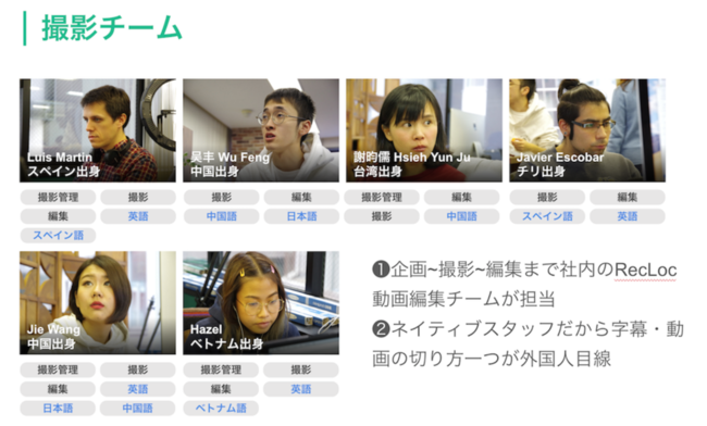 弊社には、15人の外国人からなる動画制作専門チームが存在します。マーケティング支援業務の他、弊社運営のインバウンド動画アプリ「RecLoc」にて、毎月200本以上の動画を制作。