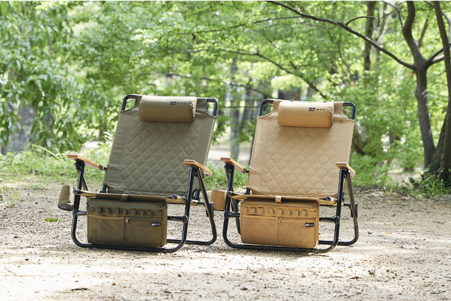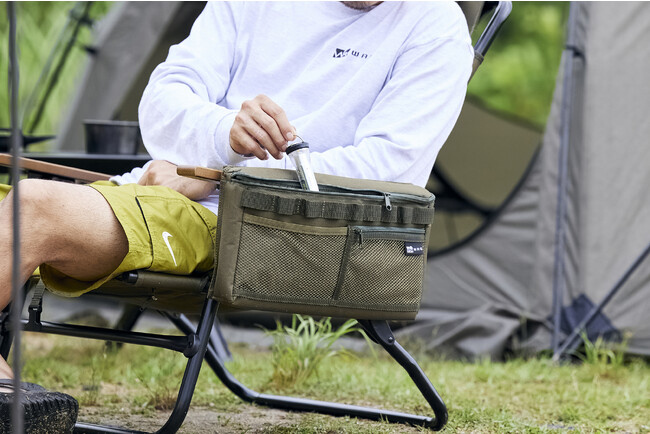 座面下に小物の収納に便利なストレージバッグを標準装備。ジッパー式で取り外しもでき、サイドの肘置き部分にも取り付ける事が可能です。ウレタン内蔵で保冷効果もあるため、保冷剤を入れれば簡易的なクーラーバッグとしても利用可能です。
