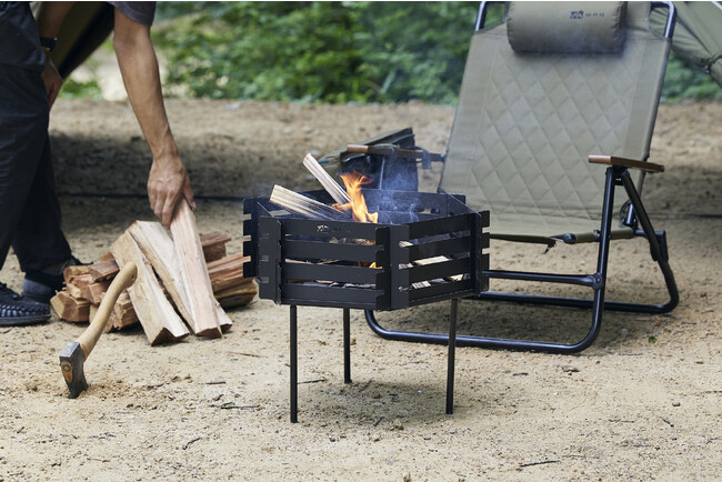 座面部分には製造工場で施策を重ね、テストをクリアした難燃素材を採用。焚き火中に爆ぜた火の粉が当たっても燃え広がりにくい仕様となっています。※防炎素材では有りませんのでご了承ください。