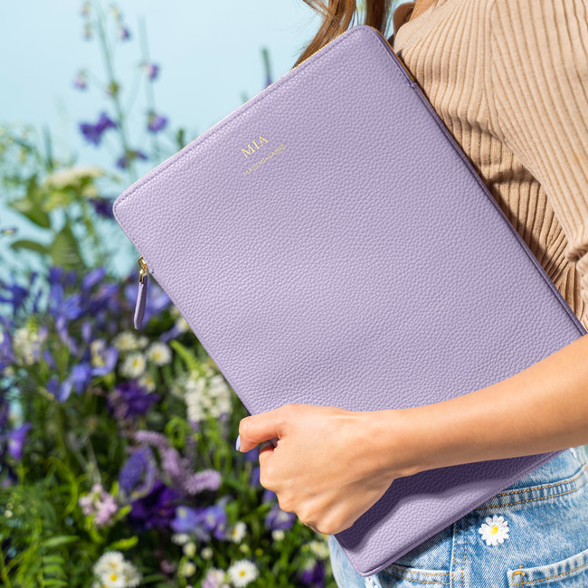 通学や通勤に必須なパソコンケース。上質なグレインレザーを使用し、究極のスリムさを実現した縦型のラップトップスリーブ。縦と横にマチがある設計のため、しっかりと掴めて安全にノートパソコンを持ち運べます。内側には手触りの良いスエードを使用し、しっかりとデバイスを保護。主張しすぎず日常生活に取り入れやすいラベンダーパープルは自分用にはもちろんのこと、入学や就職祝いのギフトにもおすすめです。