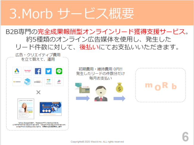 「BtoB特化型完全成果報酬型オンラインリード獲得支援サービス Morb(β版)」は、BtoB商材に特化した完全成果報酬型オンラインリード獲得支援サービスになります。Wasld株式会社(以下、弊社)が広告費とクリエイティブ制作費用を全て立て替えて、発生したリードの件数に対して後払いにてお支払いいただきます。(初期費用、維持費用 0円)
