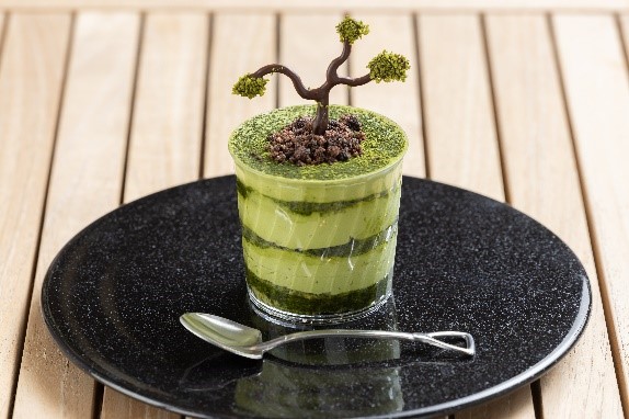 アイスクリームにかかった抹茶味のグリーンパウダーが苔をイメージしており、枝部分はチョコレートで見立てています。