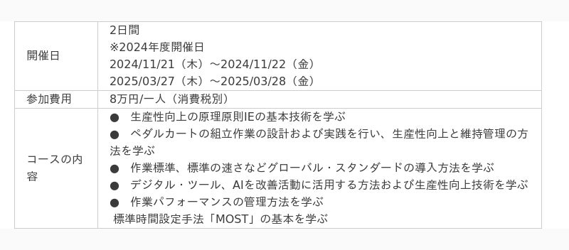 今回リリースした「Smart Kart Factory(スマートカートファクトリー)」は、この「カートファクトリー」プログラムをベースとし、AIとデジタル・ツールを活用し、Smartな生産性向上活動の展開と生産性向上技術IE(インダストリアル・エンジニアリング)の習得に特化しています。