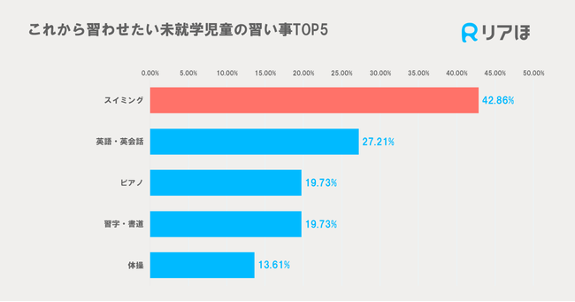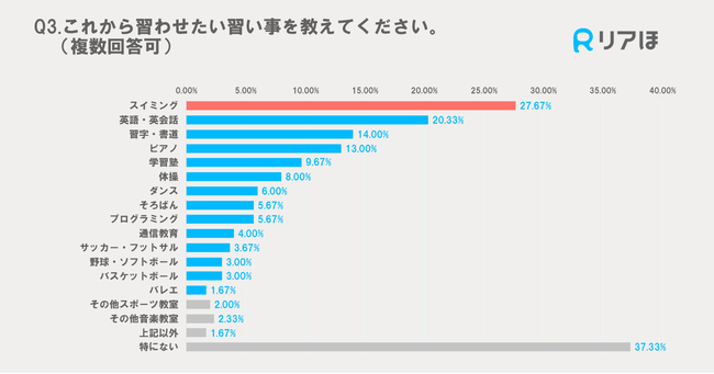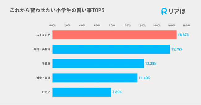 これから習わせたい習い事に関しては、「スイミング」の1位は変わらず27.67%、次いで「英語・英会話」、「習字・書道」、「ピアノ」の順となり、現在習っている習い事では8位だった「習字・書道」が3位にランクインしました。