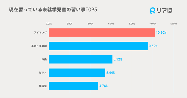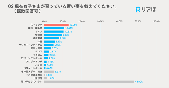 現在お子さまが習っている習い事については、「スイミング」が最も多く13%、次いで「英語・英会話」、「ピアノ」、「学習塾」の順となりました。