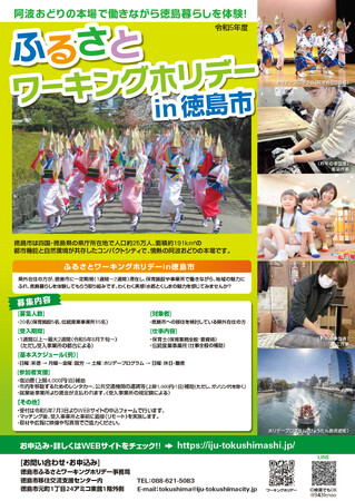 徳島市では徳島県外から本市への移住希望者を対象に、実際に徳島市内に滞在し、就労や暮らし・魅力を体験してもらう「徳島市ふるさとワーキングホリデー」を令和3年度より実施しています。