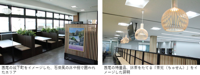 また、食堂は西尾市の特色を盛り込んだ空間に仕上げ、西尾市の魅力を発信するとともに、食堂利用以外にも活用できるよう、モニターを設置するなどICTツールを整えました。さらに、24時間無人売店を導入して利便性を向上しました。