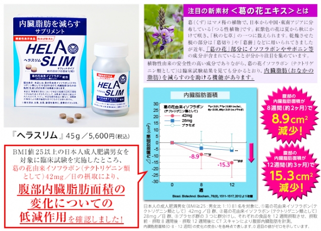 『ヘラスリム』は、葛の花由来イソフラボン(テクトリゲニン類として)を配合した内臓脂肪を減らすサプリメントです。葛の花由来イソフラボン(テクトリゲニン類として)には、内臓脂肪(おなかの脂肪)を減らすのを助ける機能があります。BMI値25以上の日本人成人肥満男女を対象に実施した臨床試験においても、葛の花由来イソフラボン(テクトリゲニン類として)42mg/日の摂取により、腹部内臓脂肪面積の変化についての低減作用が確認されています。