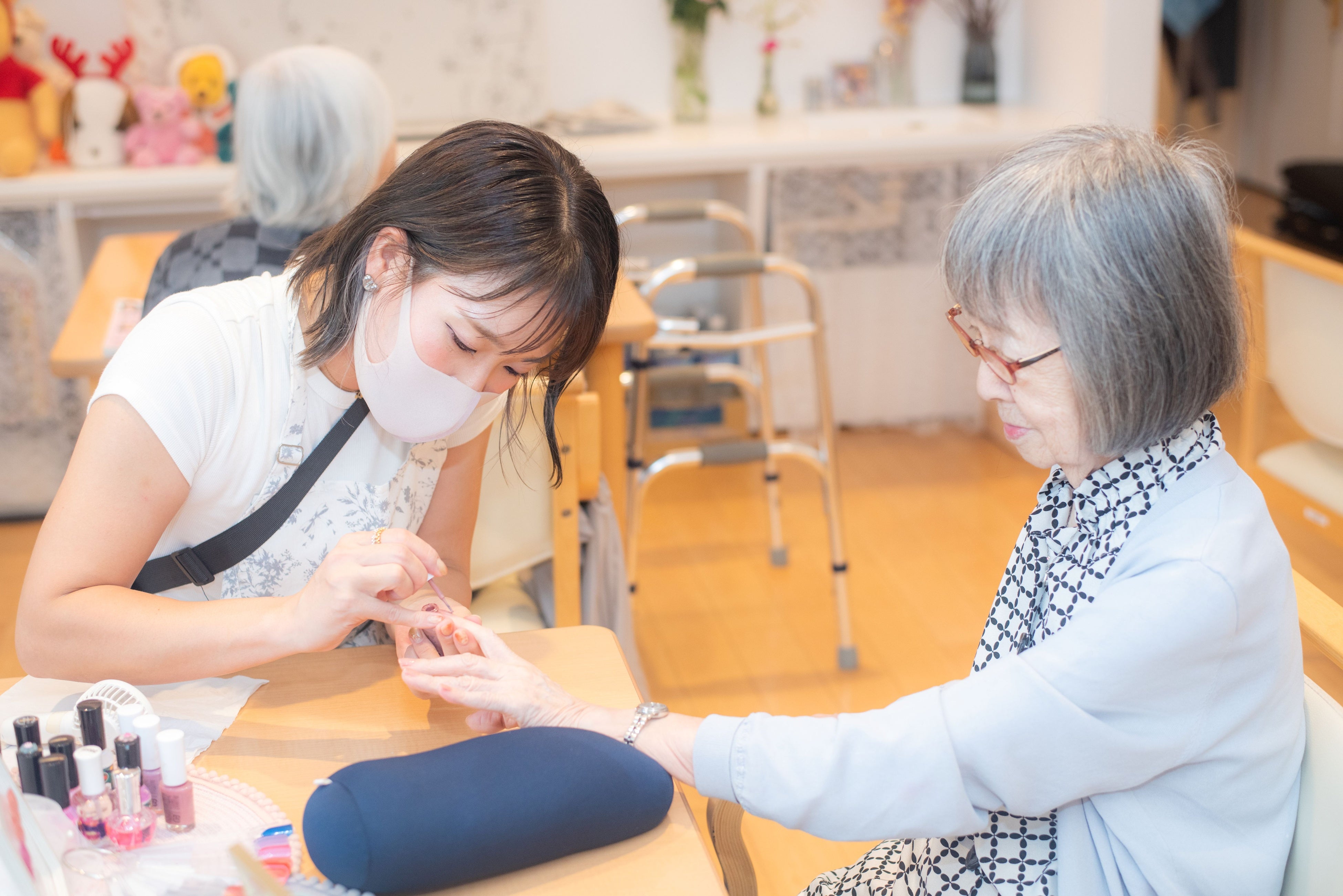 当日は、横浜校の受講生がボランティアとして地域の高齢者にワンポイントメイク・ネイルケア・ハンドトリートメントなどの美容ケアを提供。
