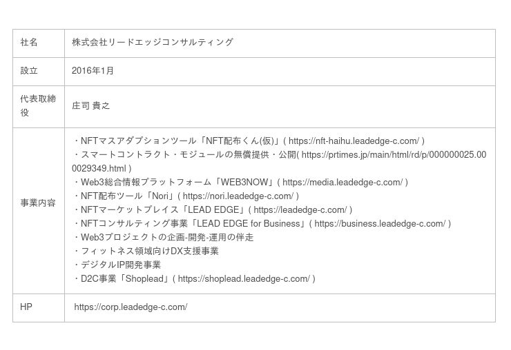 NFTのマス・アダプションSaaS「NFT配布くん」やNFTマーケットプレイス「LEADEDGE」をはじめとして、プロダクト・ソリューションの開発・提供に取り組んでおります。