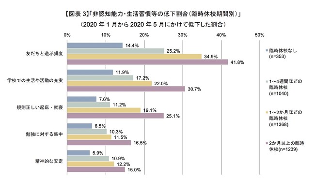 三菱UFJリサーチ&コンサルティング株式会社が実施したコロナ禍が子どもの非認知能力にもたらす影響についての調査では、子どもの読み書きや計算などの数値では測れない能力と言われている非認知能力・生活習慣等は、臨時休校期間が長いほど低下傾向(最大40%程度)にあること、特に小学生において、学校行事の中止縮小による影響が大きいことが懸念される結果となりました。