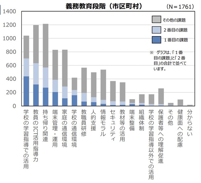 2019年に開始したGIGAスクール構想(※2)や新型コロナウイルスによる休校などをきっかけに教育現場でのDX化が進む一方で、文部科学省が全国の都道府県及び市町村を対象に調査を行ったところ、義務教育段階においては、最も課題に感じていることと次に課題に感じていることとして、「学校の学習指導での活用(701/1761団体、39.8%)」「教員のICT活用指導力(631/1761団体、35.8%)」「持ち帰り関連(568/1761団体、32.3%)」が挙げられました。