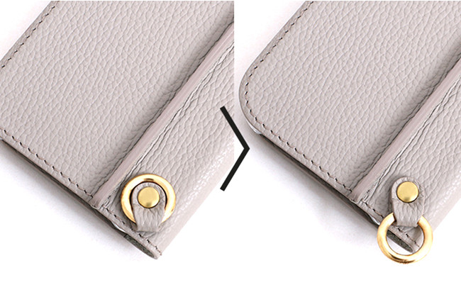 吊り下げリングがあることでスマートフォンの居場所ができる。生活スタイルが広がる。HUKUROアイテムにはストラップを取り付ける為の専用リングを付けています。リングを使用しない時にも見た目を損なわない設計ですが、ぜひストラップを付けてお使いください。