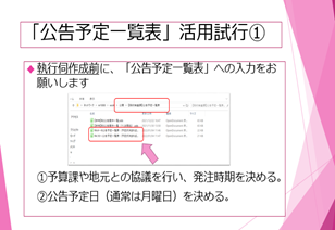 ・工事の発注時期が毎年6月〜8月に集中することにより、過度な残業を引き起こしていたことが業務スケジュールの見える化をしたことで判明しました。そのため、2022年度以降は、「公告予定一覧表」を作成し、公表工事の平準化に向けて効果を検証し、会津若松市内の建設業界全体の課題につながる取組みの一歩となりました。