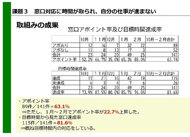 ・窓口対応は本来業務であるものの、予定外の来庁者対応により、計画的に業務が進まず、残業になっていたため、来庁者に対し事前アポイント制に今後協力いただくよう、口頭で丁寧に繰り返し依頼しました。その結果、事前のアポイント(約束)による訪問が3割も増えたことに加え、来庁目的が明確になることで適切な資料の事前準備が可能となり、窓口対応する職員の残業時間は取組前と比べて38%減少しました。