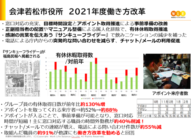会津若松市役所で初の働き方改革試行で、モデル部署にて庁内外の問合せ件数5割減、有給取得5割増 突発的な市民からの問い合わせを事前アポ制に変更し、行政の残業減と市民満足度向上の両方を達成