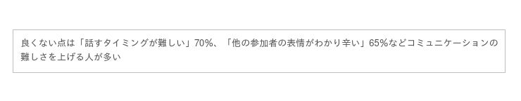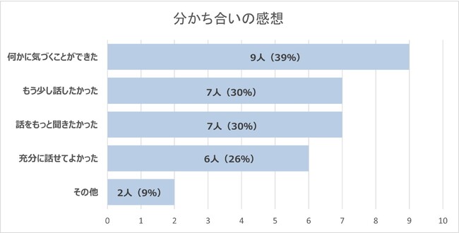 ■オンラインによる「分かち合い」により、「何かに気づくことができた」41%、「充分に話せて良かった」27%という結果の反面、「もう少し話したかった」32%、「話をもっと聞きたかった」32%と、物足りなさを感じる人もいる。