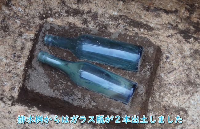 格納庫の物資や照空灯が水に濡れないように作られた排水桝(はいすいます)からは、殺虫剤のガラス瓶が出土しました。当時の環境を知ることのできる資料です。