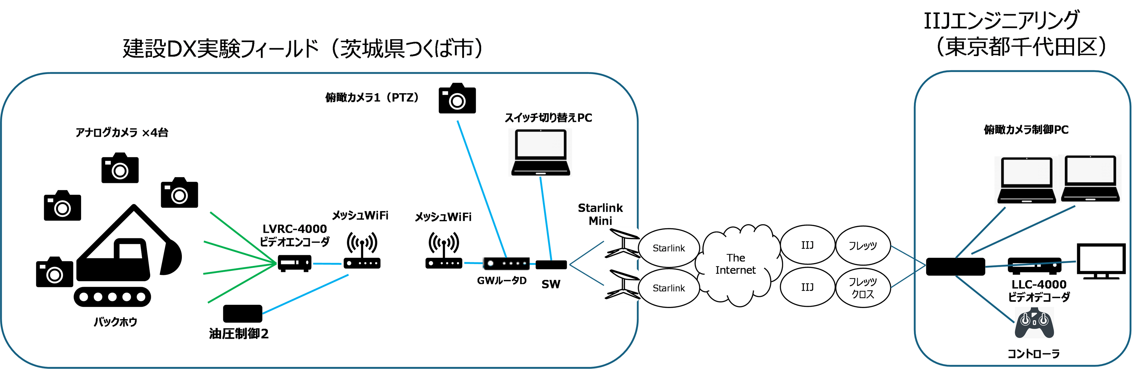 実証実験は建設DX実験フィールドにおいて、建機に搭載した4台のハイビジョンカメラの映像を高圧縮で符号化可能なハイビジョンビデオエンコーダー「LVRC-4000」*2により圧縮、さらに現場を俯瞰するためのハイビジョンカメラ1台、計5台のカメラ映像をメッシュWi-Fi、2台の「Starlink Mini」、2種類のフレッツ光回線を介してIIJエンジニアリング本社オフィスとの間で伝送を行いました。同時にオフィス側からは、建機操作とカメラコントロール用のデータも送信しました。片側回線断や再接続など回線状況を変化させても安定して映像を低遅延で伝送し、良好な操作性で建機を操縦できることが確認できました。