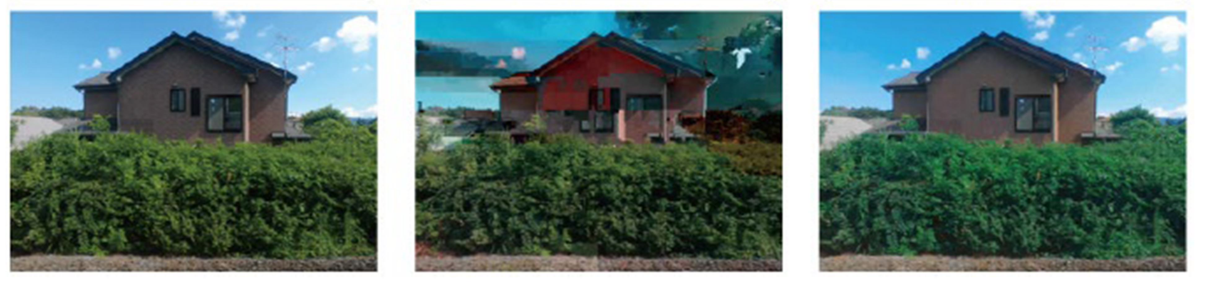 図4 伝送エラー耐性(左:元画像、中央:BAERTオフ、右:BAERTオン)
