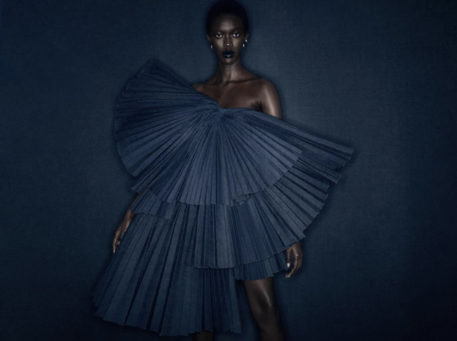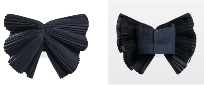 またプレタポルテとしてウェアラブルなボウ トップも制作しました。プリーツ・リボンのこのトップスは、力強くもフェミニンなスタイルで、大胆に個性を主張することができます。セルビッチデニムとチュールで作られたクラシックなリボンは、モダンなイブニングウェアの定番となることでしょう。