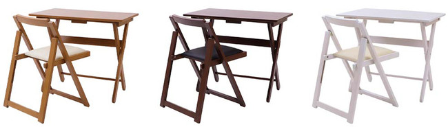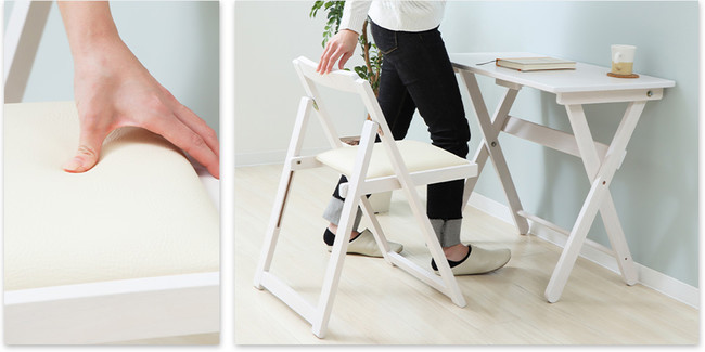 天然木の風合いが優しい「折りたたみデスク&チェアセット」は、チェアはもちろん、デスクも折りたたみが出来るので、使わないときはさっと畳んでしまえるところが魅力です。またコンパクトなサイズ設計なので、限られたスペースでも使いやすい便利さ、クッション性のある座面が体にやさしいこと、シンプルなデザインがどんなお部屋にも馴染むことなど、お客様からの多くの「いいね!」がロングセラーの理由となっています。