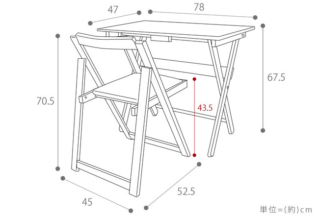 サ イ ズ :<デスク>(約)幅78×奥行47×高さ67.5cm、<チェア>(約)幅45×奥行52.5×高さ70.5cm(座面高さ)43.5cm