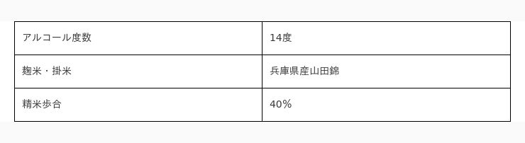 華やかさと甘み、旨みのバランスが取れている純米吟醸。外観は透明感のある淡いクリスタル、若干のイエローの色調がある。香りの第一印象は華やかで芳醇。熟したリンゴや洋梨、白桃のような果実香、アカシアの蜜のような甘みのある吟醸香が感じられる。また、上新粉や白玉団子のような控えめな米の香り、サワークリームのような香りも感じられる。味わいはやや強い、まろやかでふくよかな第一印象。酸味はなめらかであり、甘みとバランスがとれている。全体的にはまろやかながら芳醇な印象。余韻はやや長く、旨みが持続する。ペアリングは、濃いめの味付けの煮物や炒め物がよく合い、6-8度ぐらいでしっかり冷やして飲むのがおすすめ。