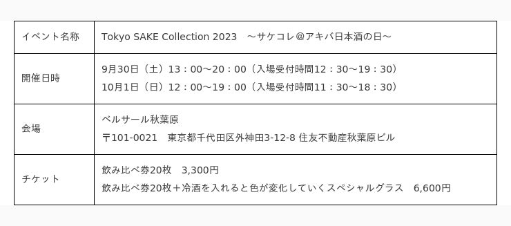 9月30日(土)・10月1日(日)の2日間「Tokyo SAKE Collection 2023〜サケコレ@アキバ日本酒の日〜」に出展することとなりました。当蔵からは人気銘柄「醸す森」・「深然」の2種類をご用意して参加いたします。