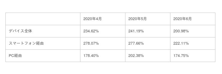 また、6月をデバイス別に見てみると、PCよりもスマートフォンの加速が落ち着いた、という結果が出ています。