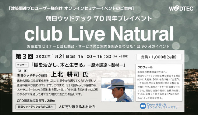 朝日ウッドテック株式会社(大阪市中央区南本町4-5-10 海堀哲也社長)は、来年、前身である銘木業としての創業から110年、創立から70周年を迎えます。この節目を迎えるにあたり、各業界で活躍されている方々を講師として招いた全5回のオンラインセミナーイベント「club Live Natural」を開催しています。第3回セミナーでは、現代の杢匠として木材の買い付けに携わってきた当社の上北耕司が登壇し、フローリング製品になるまでを見据えた原木調達や製材方法について講演いたします。