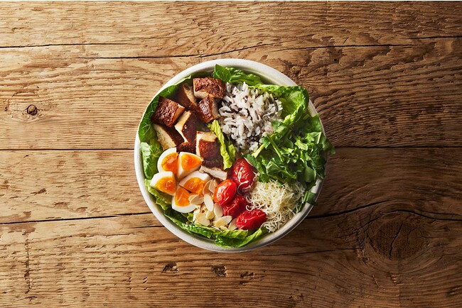 スパイスとハーブ香るケイジャン風味のブラッケンチキンと、ボイルドエッグがベストコンビネーション。スパイシーなのにマイルド、食感も楽しく、春らしい彩り豊かなワイルドライス入りの満足度が高いボウル。