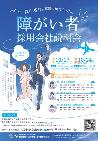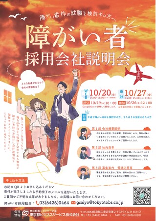 この度、東京都が出資する第三セクター企業である東京都ビジネスサービス株式会社(本社:東京都江東区、代表取締役社長:根津 史明、以下「当社」)は、障がい者枠での就職を検討されている方を対象とした10月度の会社説明会を開催することとなりましたので、お知らせいたします。