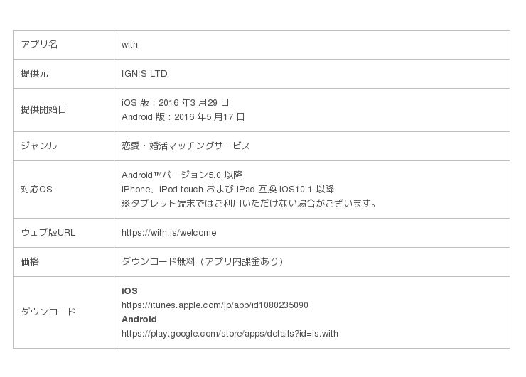 『with』は、今後もユーザーのアクセスの利便性をさらに高めると同時に、精度の高いマッチングを実現する機能を継続的に投入していくことで、ユーザー満足度の高いサービスを目指してまいります。