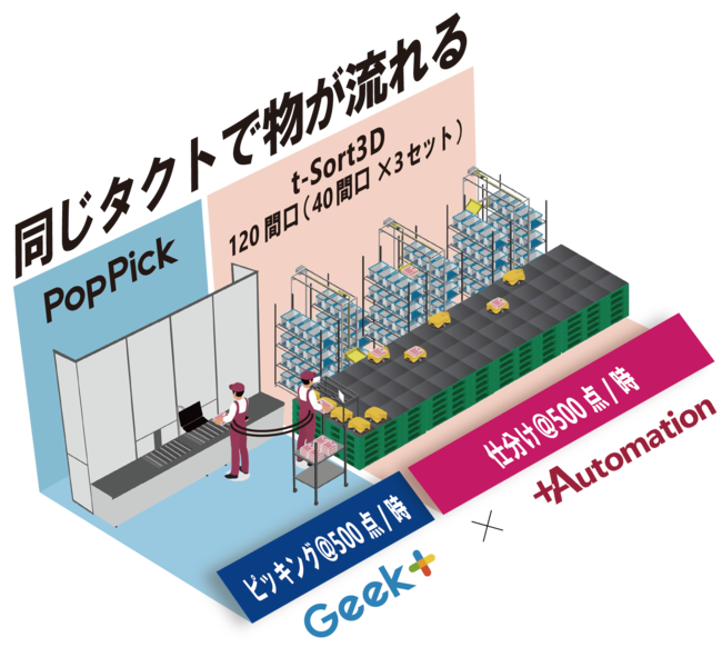 今回、ギークプラスと構築した協業ソリューションでは、その特徴を最大限に活かし、従来DAS(Digital Assort System)が用いられていた「PopPick」からのピッキング後の仕分け工程に「t-Sort 3D」を連携させました。