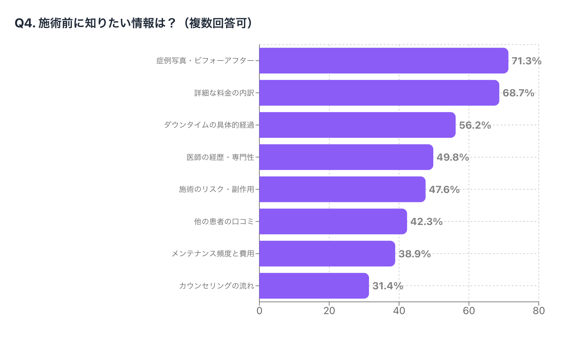 その結果、「実際の症例写真・ビフォーアフター」が71.3%で最多となり、次いで「詳細な料金の内訳」(68.7%)、**「ダウンタイムの具体的な経過」(56.2%)**という結果になりました。