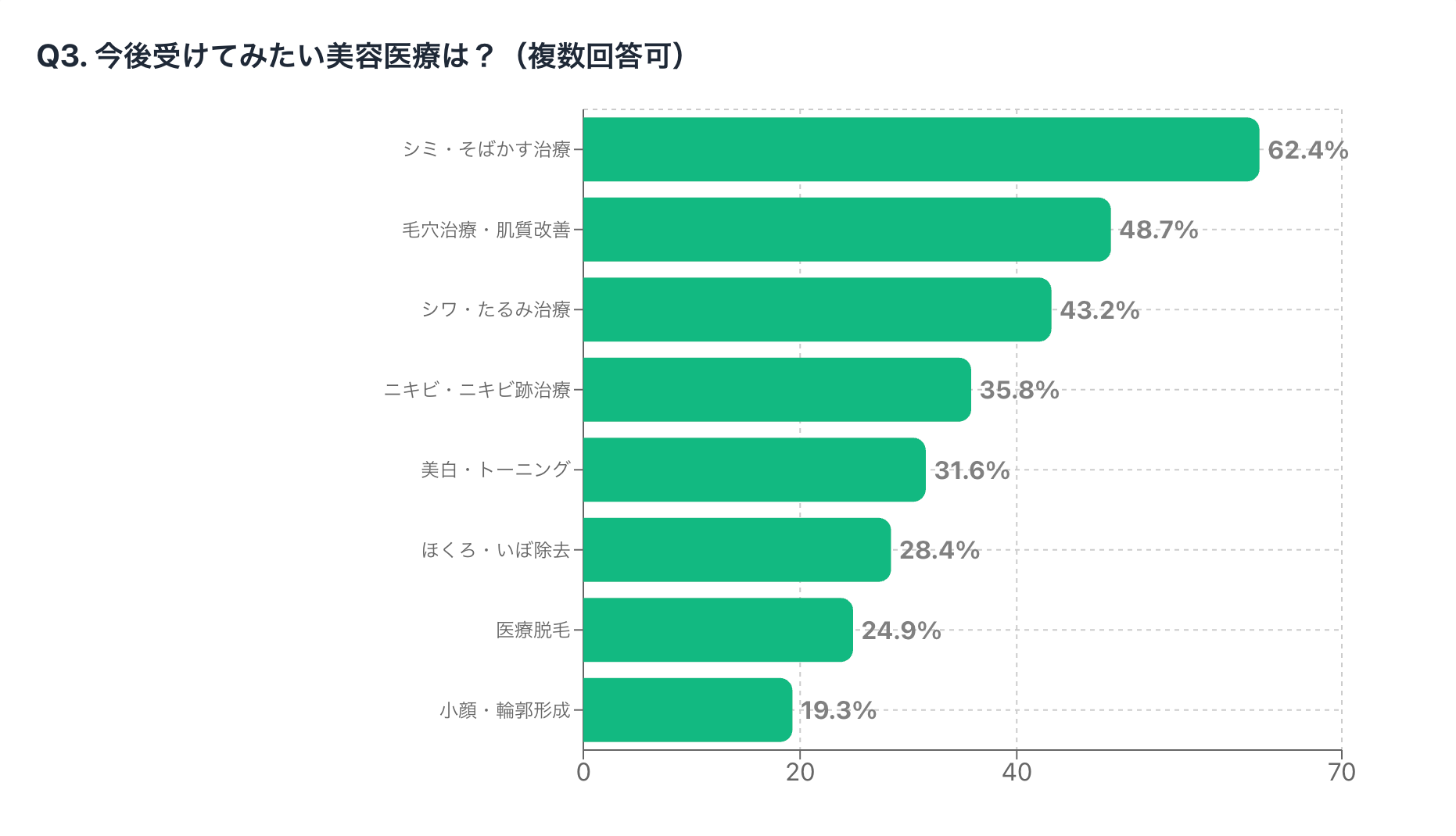 その結果、「シミ・そばかす治療(レーザー等)」が62.4%で最も多く、次いで「毛穴治療・肌質改善」(48.7%)、**「シワ・たるみ治療(ヒアルロン酸等)」(43.2%)**という結果になりました。