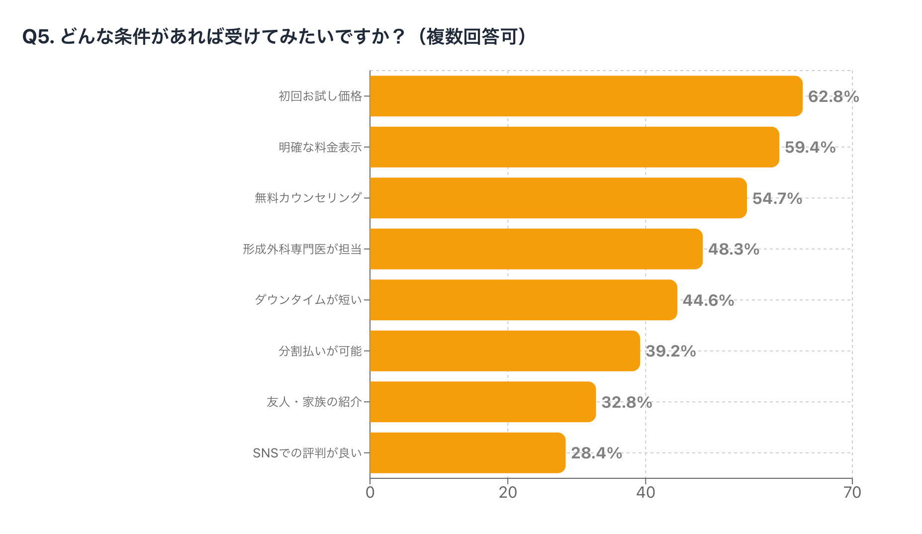その結果、最も多かったのは**「価格が高い・不透明で不安」(63.2%)、次いで「失敗や副作用が怖い」(58.4%)、「効果がどれくらい続くか分からない」(47.8%)**という結果になりました。