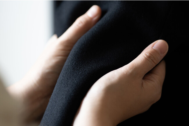 ぎゅっと目が詰まった高密度な生地ゆえに、ジャージーとは思えない織物(布はく)と見間違えるほどのしっかりとした風合い。ジャージーだからこそ伸縮性もあり、着心地も抜群です。