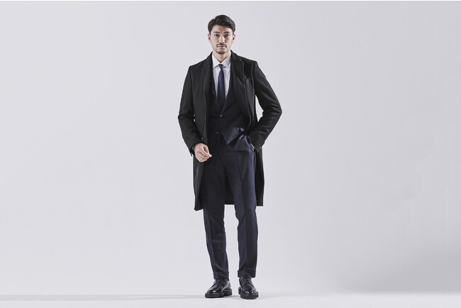 スーツ・コートともに2022年秋冬にMOVBから新登場した「Optima 16.5 Meriono Jersey」を使用。