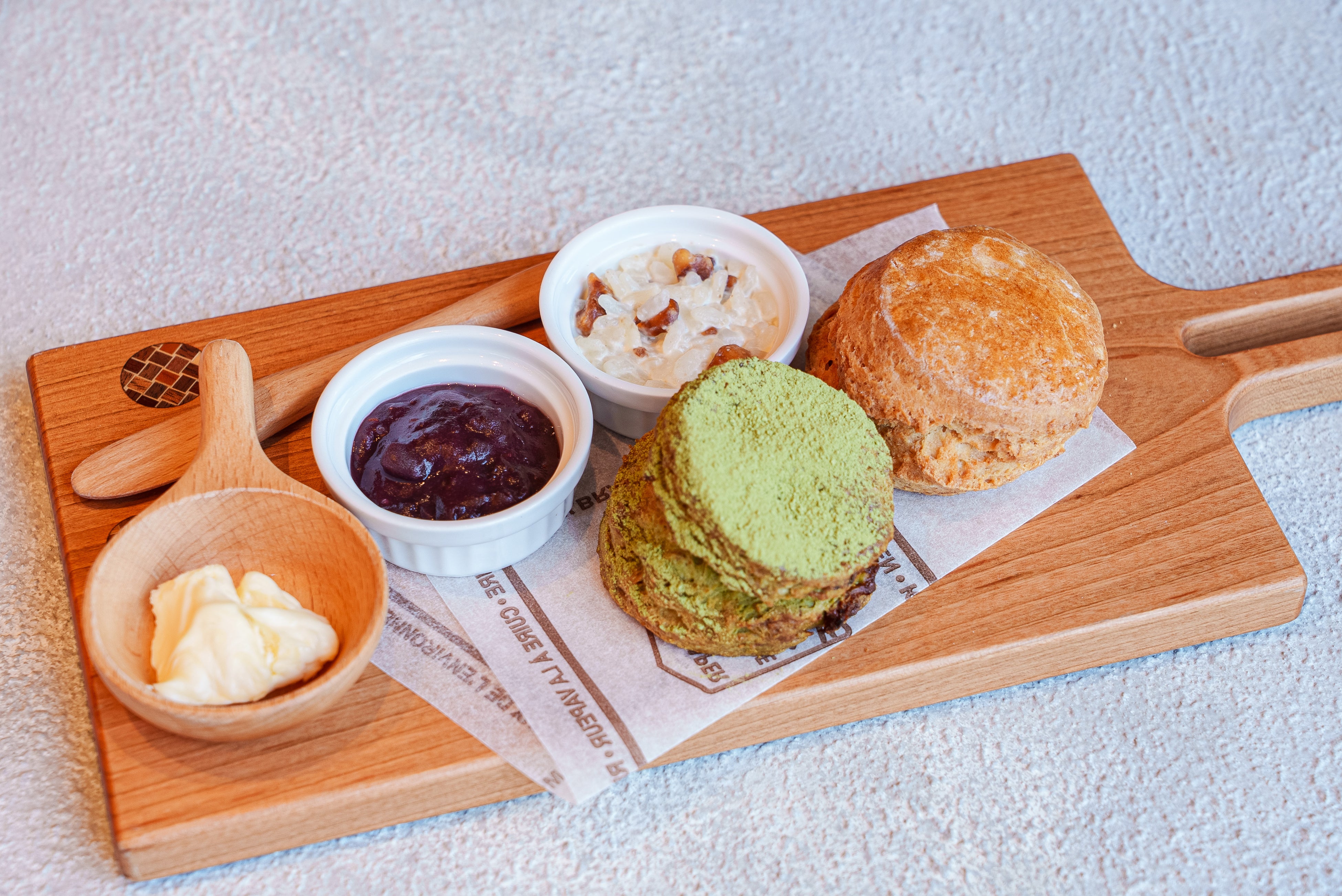 定番として人気の高い「全粒粉スコーン」に加え、シーズン限定のスコーンには、自然の息吹をイメージさせる美しいグリーン色の抹茶を用い、中に豊かさと繁栄の象徴として幸せを呼び込むと言われる開運フード、イチジクをセミドライで忍ばせました。また、オリジナルのコンフィチュールを2種ご用意。1種は、命の源といわれる「お米」と金運アップに効果がある「胡桃」を使って、もう1種は、幸運のシンボルである「小豆」と愛を呼び込む果物と言われる「ラズベリー」をあわせました。その他、定番の自家製クロテッドクリームを添えてご提供いたします。
