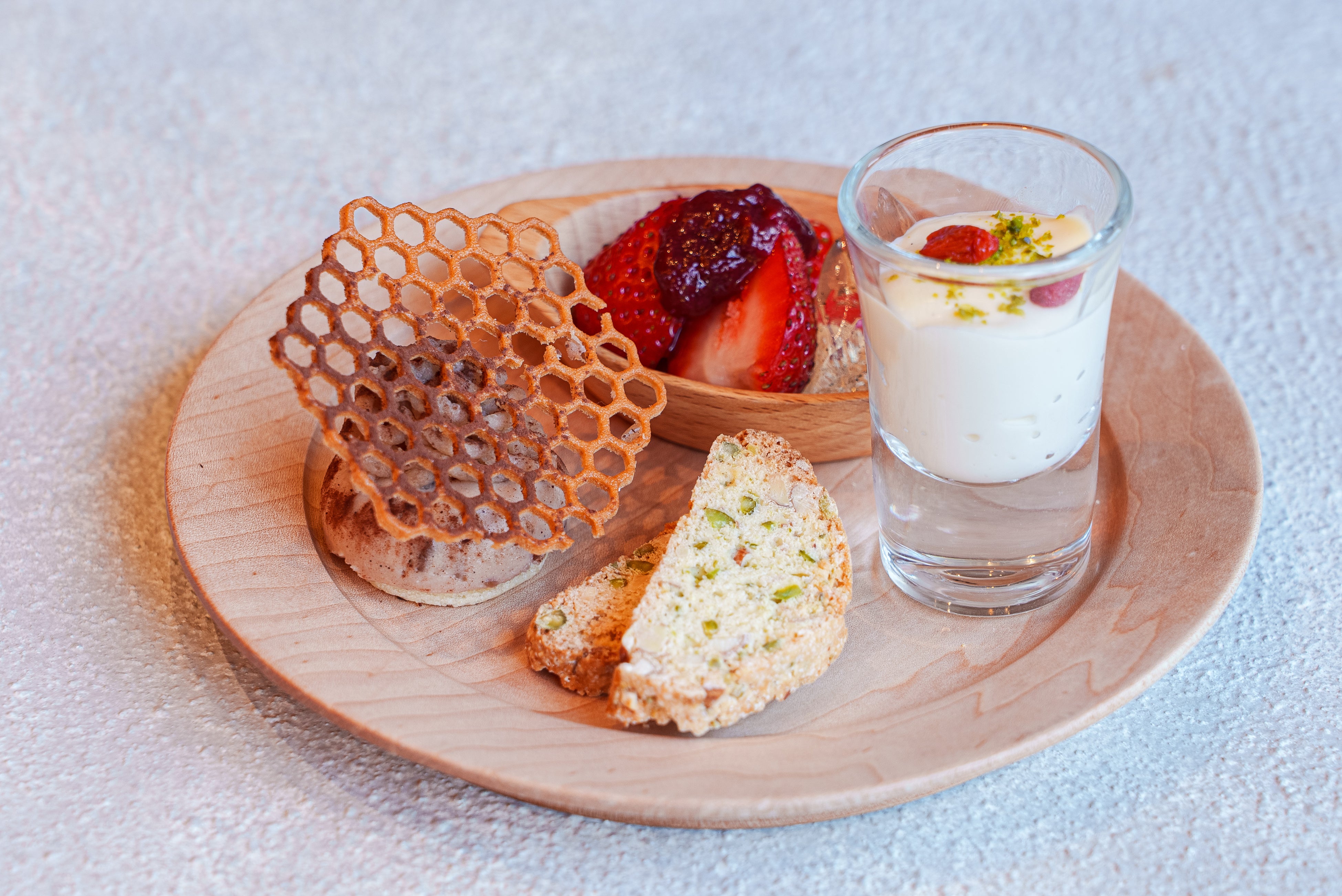 優しい甘さと滑らかな舌触りが特徴のブランマンジェにカスタードクリームをトッピング。不老長寿の実と言われ、中国では縁起物としても愛されるクコの実をトッピングし、紅白カラーで仕上げました。