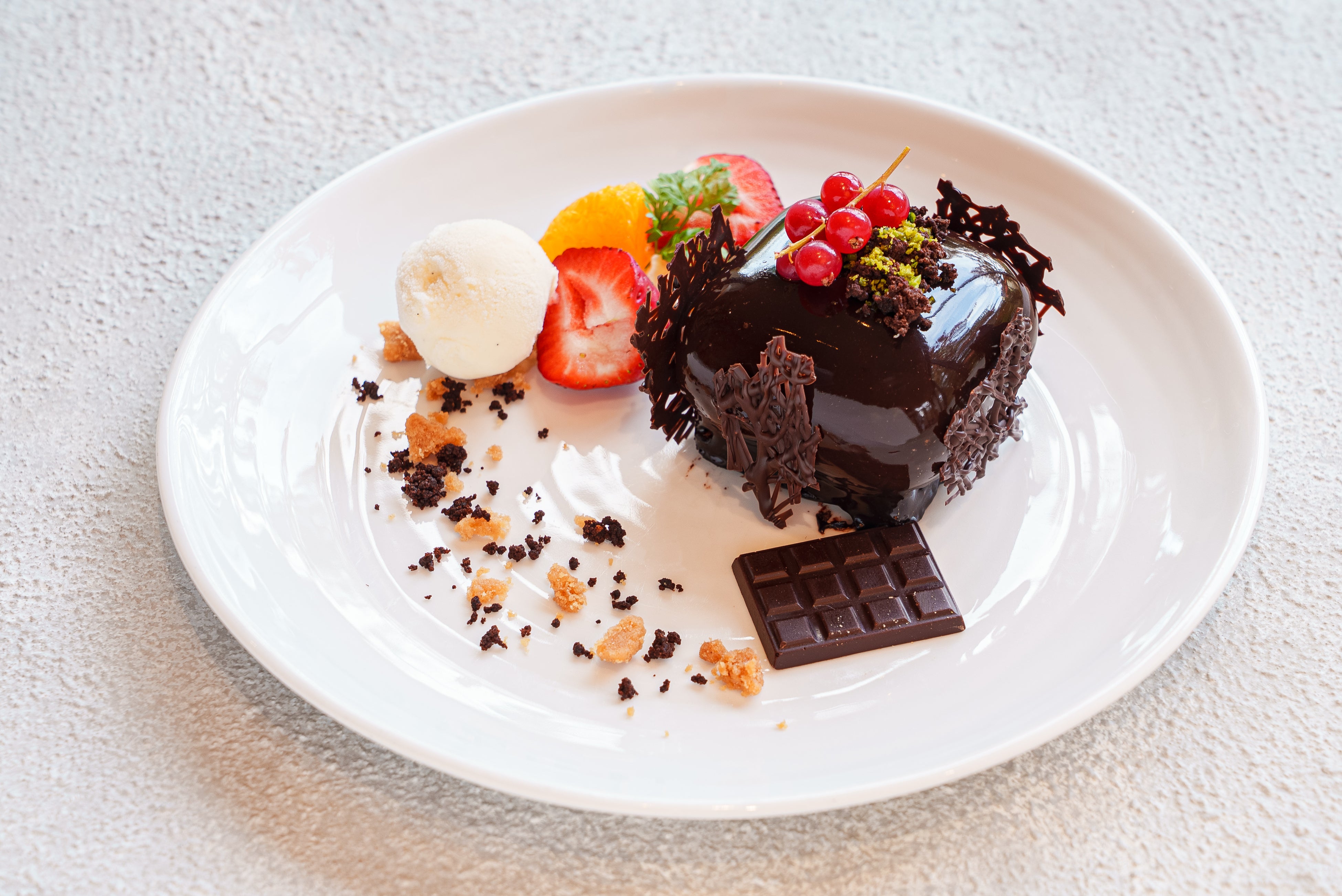 季節のケーキは、豊潤なチョコレートの風味を存分に堪能できるチョコレートムースが登場します。クラシックなスタイルを守り作り上げたチョコレートムースの中には、チョコレートと相性抜群のピスタチオムースを忍ばせており、チョコレートの香りとピスタチオの風味とのベストマッチングをお楽しみいただきます。サイドにはバニラアイスクリームと苺、柑橘、プレートチョコレートが添えられています。