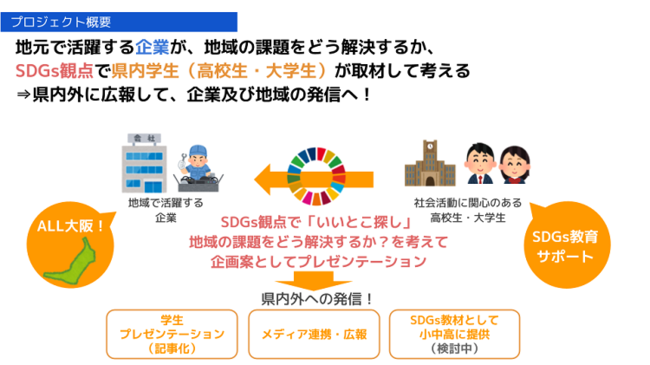 本プロジェクトでは、社会活動に関心のある近畿大学附属高等学校の生徒が、地元で活躍する企業を取材し、SDGsの観点で地域の課題をどのように解決できるかを考え、企画を立案してプレゼンテーションを行います。当日は高校生が8チームに分かれてプレゼンテーションを行い、取材にご協力いただいた企業様をはじめとする審査員がフィードバックや表彰を行います。