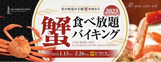 関西国際空港の対岸にある地上256mの超高層ランドマークタワー、スターゲイトホテル関西エアポート(所在地:大阪府泉佐野市りんくう往来北1番地)は、54階 ダイニング&バー「スターゲイト」にて、2023年1月13日(金)〜2月26日(日)までの、木〜日曜日・祝 限定でボイル蟹とシェフ自慢のホテルグルメが食べ放題の「蟹食べ放題バイキング2023」を開催いたします。ボイルした本ズワイガニ、紅ズワイガニなどの他に、握り寿司やスモークサーモンのムース、カニクリームコロッケ、蟹あんかけオムライスなどのホテルグルメが勢ぞろい。また、ライブ感あふれるシェフズキッチンでは、土日祝限定で焼きたてステーキをご提供いたします。ホテル最上階からのベイビューと共に、冬の味覚をスターゲイトホテルで存分にご堪能ください。