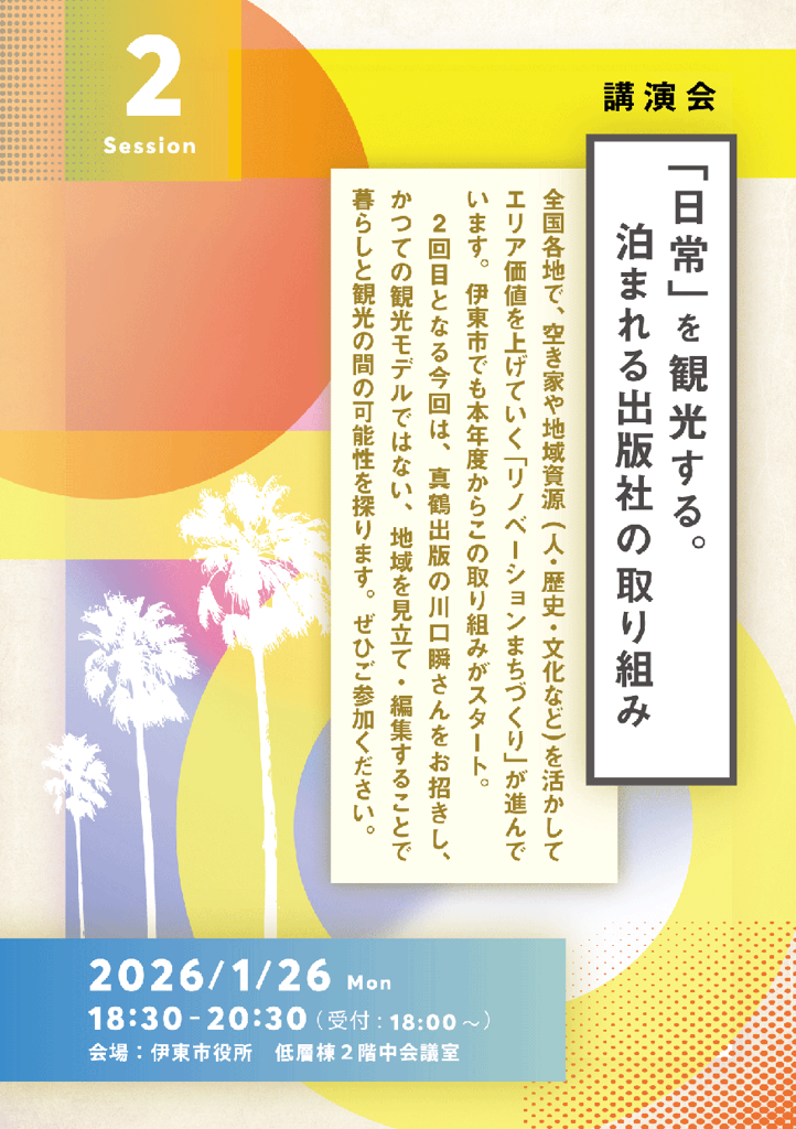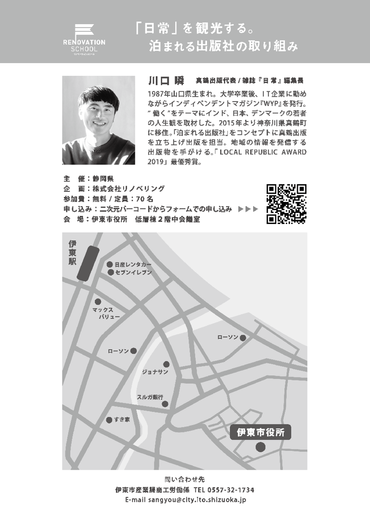 全国各地で、空き店舗・空き家や地域資源(人・歴史・文化)を活かして、エリア価値を上げていく「リノベーションまちづくり」が進んでいます。伊東市でも本年度からこの取組がスタート。今回の講演会は、その具体的な実践事例を学ぶ講演会です。これからの時代は、どうまちを見立て、どんなアクションをすることが必要なのか。2015年から神奈川県真鶴町に移住し、「泊まれる出版社」をコンセプトに真鶴出版を立ち上げ出版を担当している川口瞬さんをお招きし、観光×リノベーションのお話をしていただきます。是非、ご参加ください。