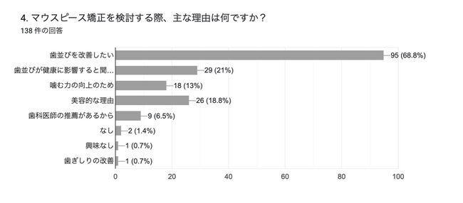 「マウスピース矯正を検討する際、主な理由は何ですか?」という質問に対し、美容的な理由でマウスピース矯正を検討している人が18.8%という結果が出ました。また、噛む力の向上を目的とする人が13%、歯並びが健康に及ぼす影響を考慮している人が21%であることも分かりました。