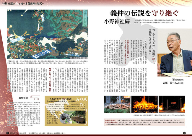 ■6〜7ページ 義仲の伝説の中から多くの伝説が残る小野神社について、地域の中での伝説の重要性などを憑史談会の会長に取材しました。3ページと同様、塩尻に残されている伝説の中から「木曽義仲の馬の足跡」について写真付きで紹介しています。