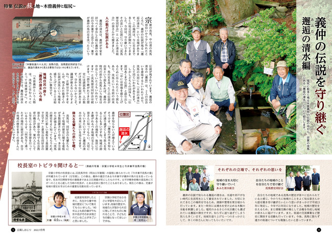 ■4〜5ページ 義仲の伝説が残る「邂逅の清水」を守り継いできた2つの団体から語り継がれてきた伝説や、守り継ぐ思いについて取材しました。合わせて、その伝説をモチーフにした像がある宗賀小学校での像の役割などについて紹介しています。